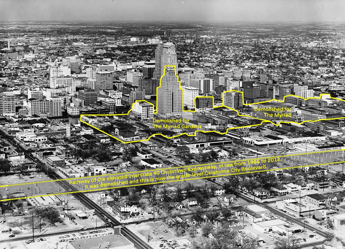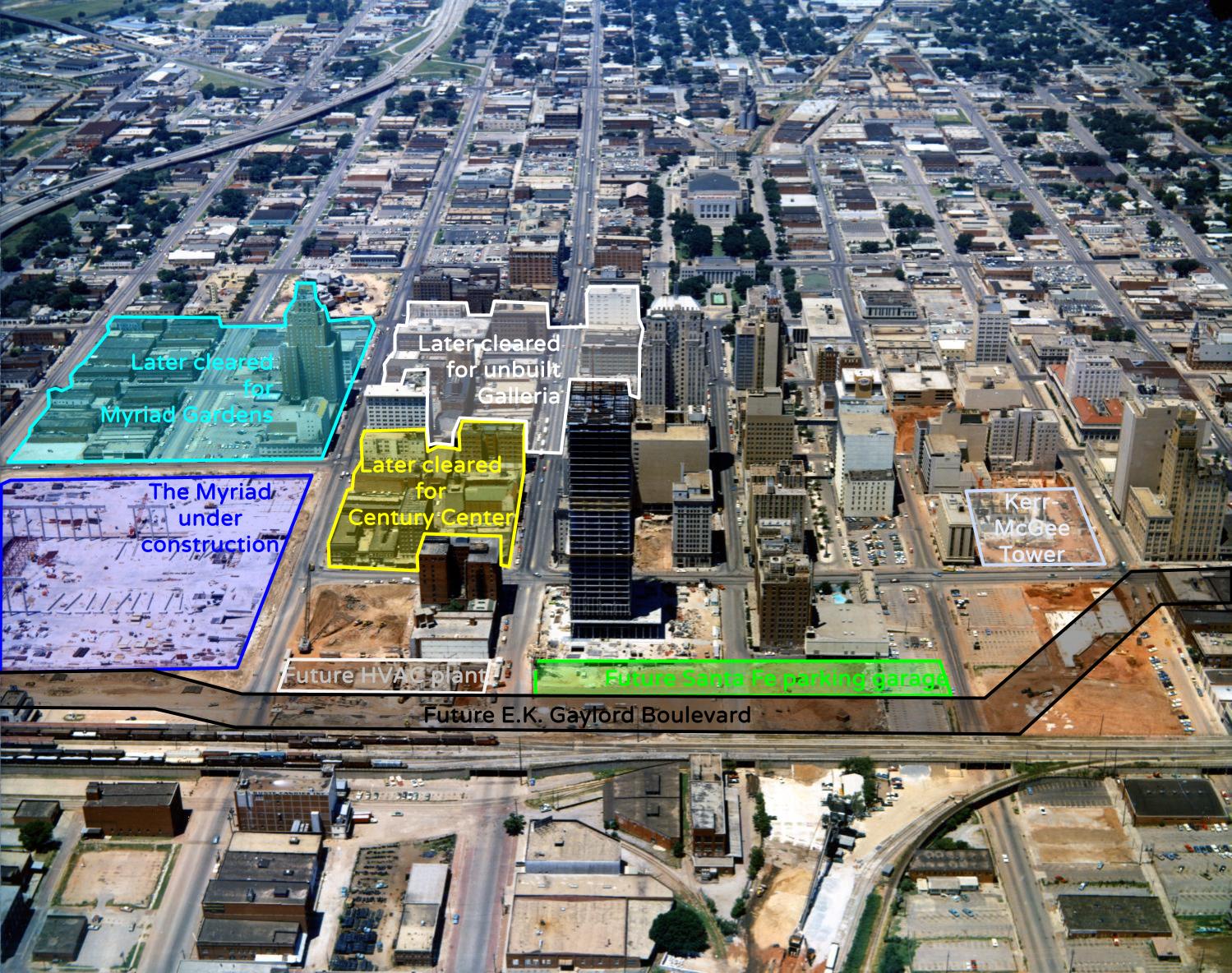 76 buildings housing 88 businesses were reportedly demolished to make room for The Myriad. The tallest was the Commerce Exchange building at the northwest corner of the property. It had been built in the mid-1920s on the site where in 1890 Henry Overholser built his first opera house.