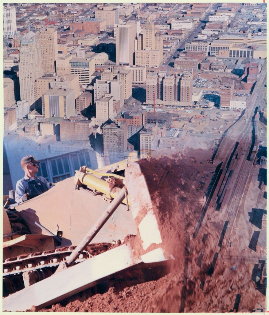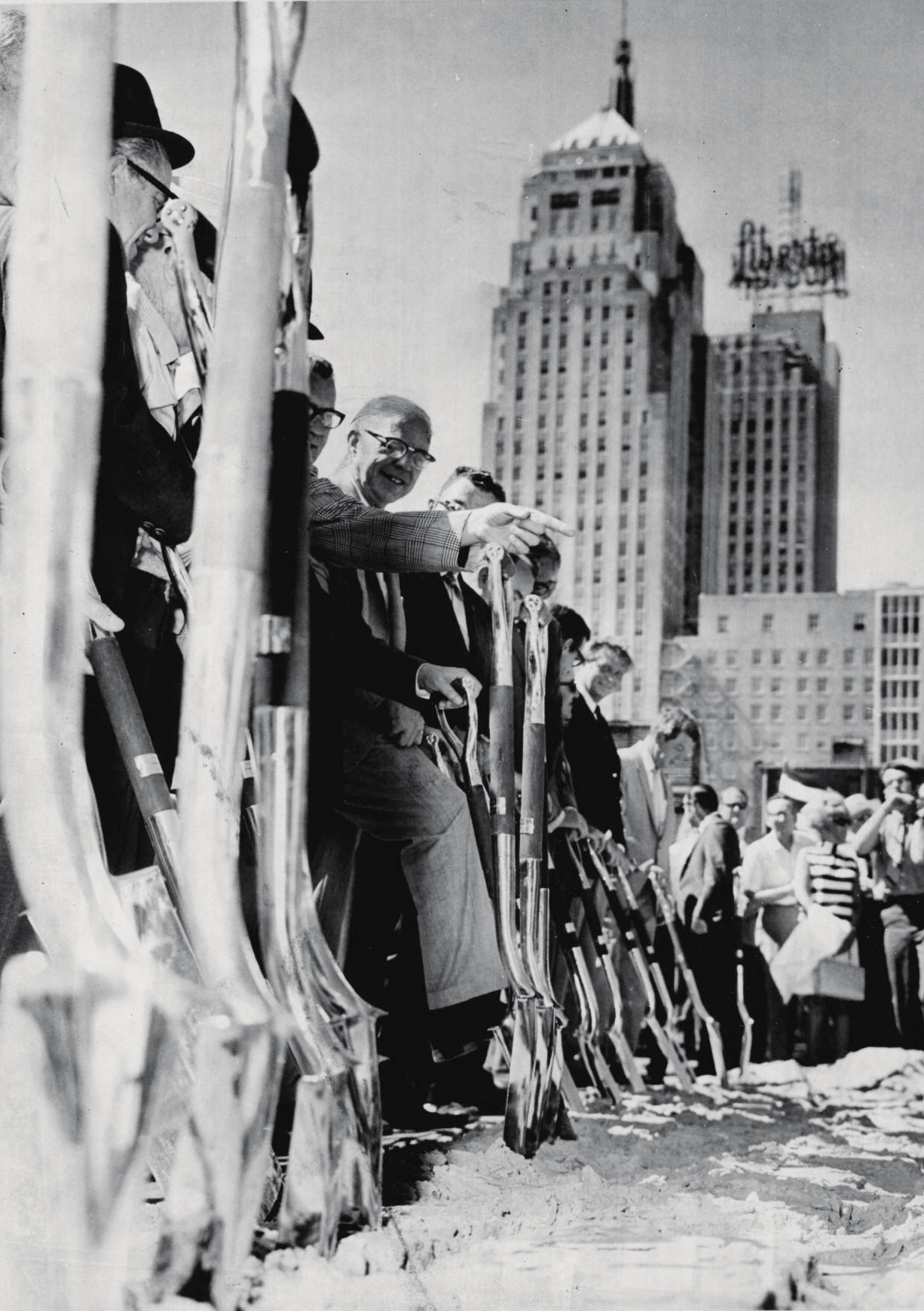 In July 1969, officials celebrated the clearing of what had been the center of the original Oklahoma City townsite of 1889, with more than twenty dignitaries posing with chrome-plated shovels to mark the start of the three-year construction project.