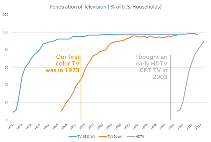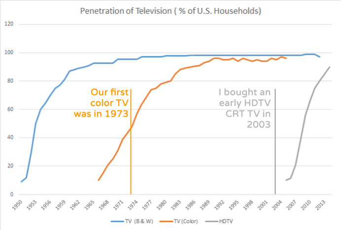 The chart shows the growth in the penetration of television technologies into U.S. households from 1950 to 2013.