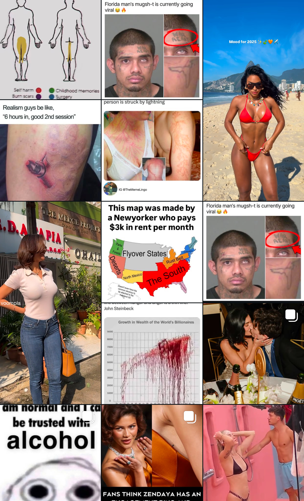 Hmm. Off-putting images of tattoos, veins, and anatomical drawings, a blood-stained graph, some meme about alcohol, a stupid map, and multiple images displaying the breasts and bikinis of women I don’t recognize — a distillation of lowbrow titillation.