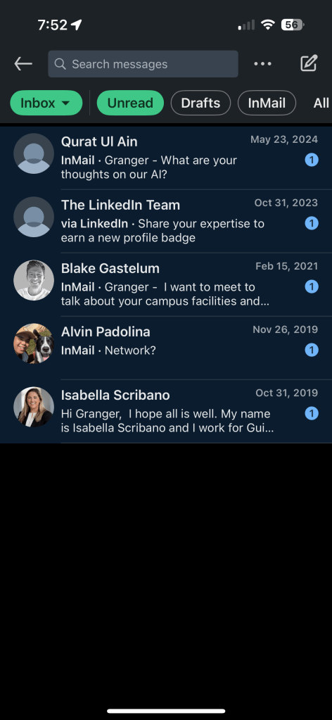 At right are unread messages in my Inbox. I’ve worked for the same employer for over 35 years, so I’m certainly not a job hunter, and I directly hire and evaluate only three positions in the district, so my usage will remain very limited. I had another LinkedIn account years ago with a personal email address, and it generated huge quantities of spam and annoying notifications, causing me to kill that account, not have the app on my phone, and set up an account with just my work email along with filters to redirect all LinkedIn emails to an unread folder.