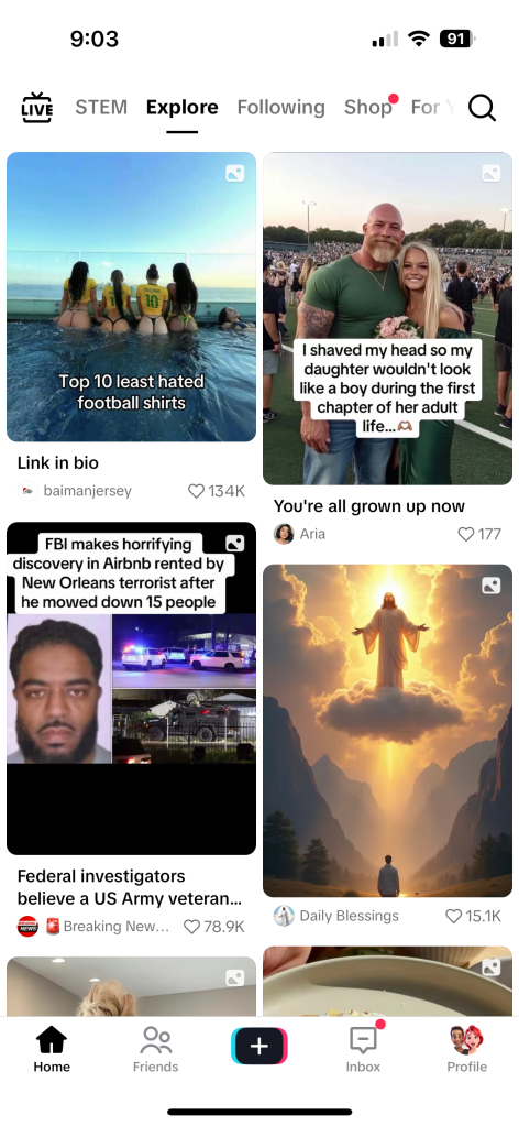 I checked out the Explore option on its Home screen, and it showed me several women in a pool displaying a great deal of cheek while wearing football shirts, an ad about a muscleman who supposedly used a hair tonic to speed up growing long locks to create a wig for his daughter, clickbait about a terrorist, and an AI Jesus. Again, all repellent trash.