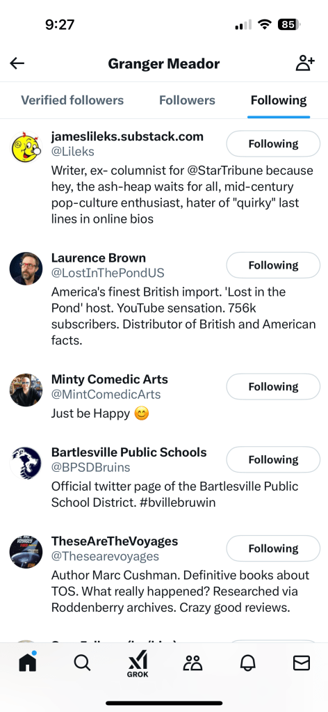 I found eight: a former newspaper columnist in Minnesota, a couple of YouTubers, a couple of school district accounts, an author of non-fiction books about Star Trek, an old friend, and a technology podcaster. Nevertheless, I’ve never paid attention to my own automated posts on Twitter/X, let alone whatever someone else posted.