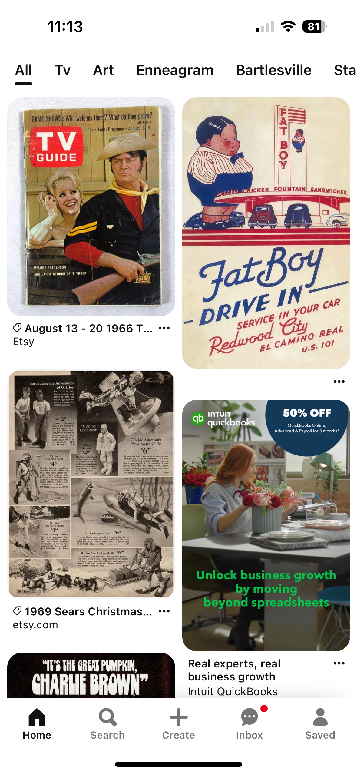 The Home page showed me an ad along with some items based on past searches. For a recent blog post on television, I had accidentally pinned an image of the cover of a 1967 issue of TV Guide that had a television equipment overview, so the service thought I might be interested in more vintage TV Guide covers, in this case one of F Troop — that was a swing and a miss.