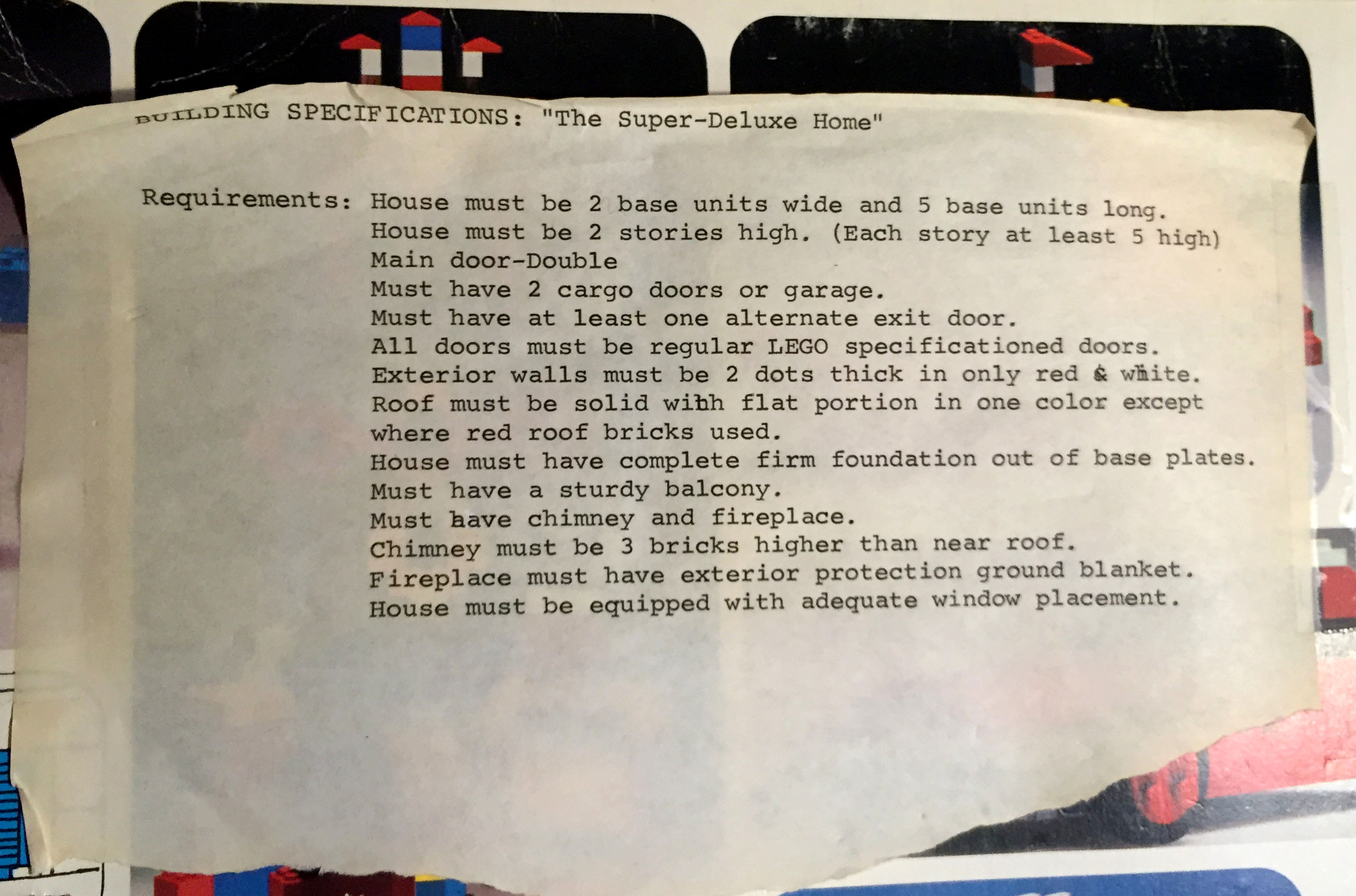Back in 2016, when Wendy and I were engaged and cleaning out Meador Manor for her later move-in, she gathered up the Legos and we donated them. In the process, she discovered taped to each box the “Building Specifications for The Super-Deluxe Home” which as a child I had typed out and affixed.