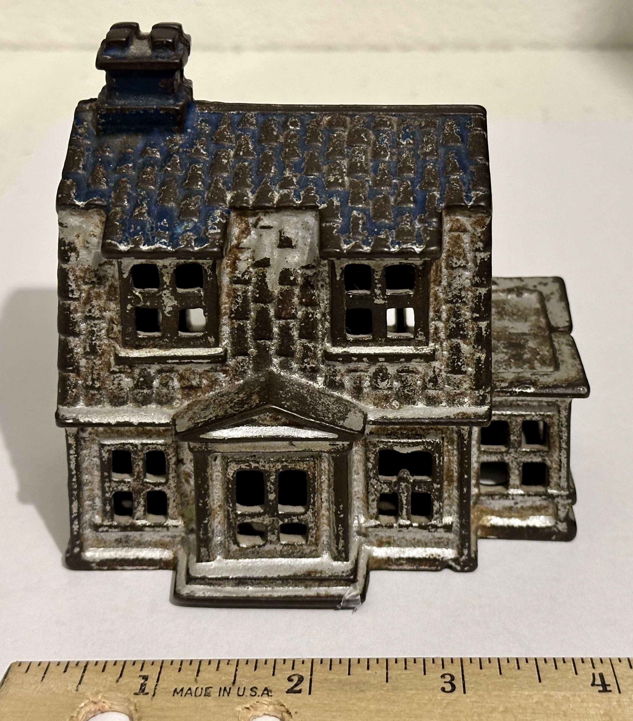 My dad’s penny coin bank from the 1920s weighs 1.3 pounds empty and is in the form of a colonial house. Such banks were produced from 1910 to 1931 by the A.C. Williams Company of Ravenna, Ohio. Their miniature banks were available in several hundred types and styles and distributed through F.W. Woolworth’s, S.S. Kresge’s, and other five-and-dime stores.