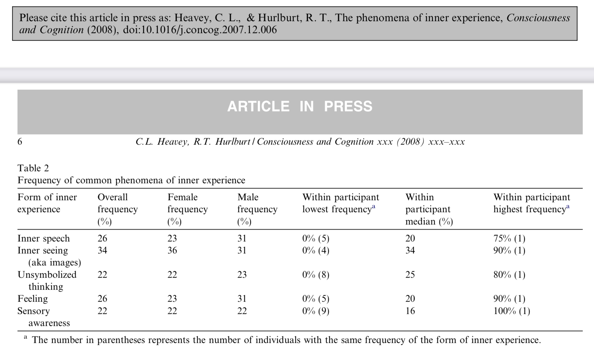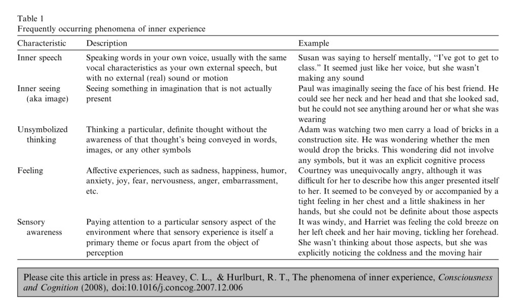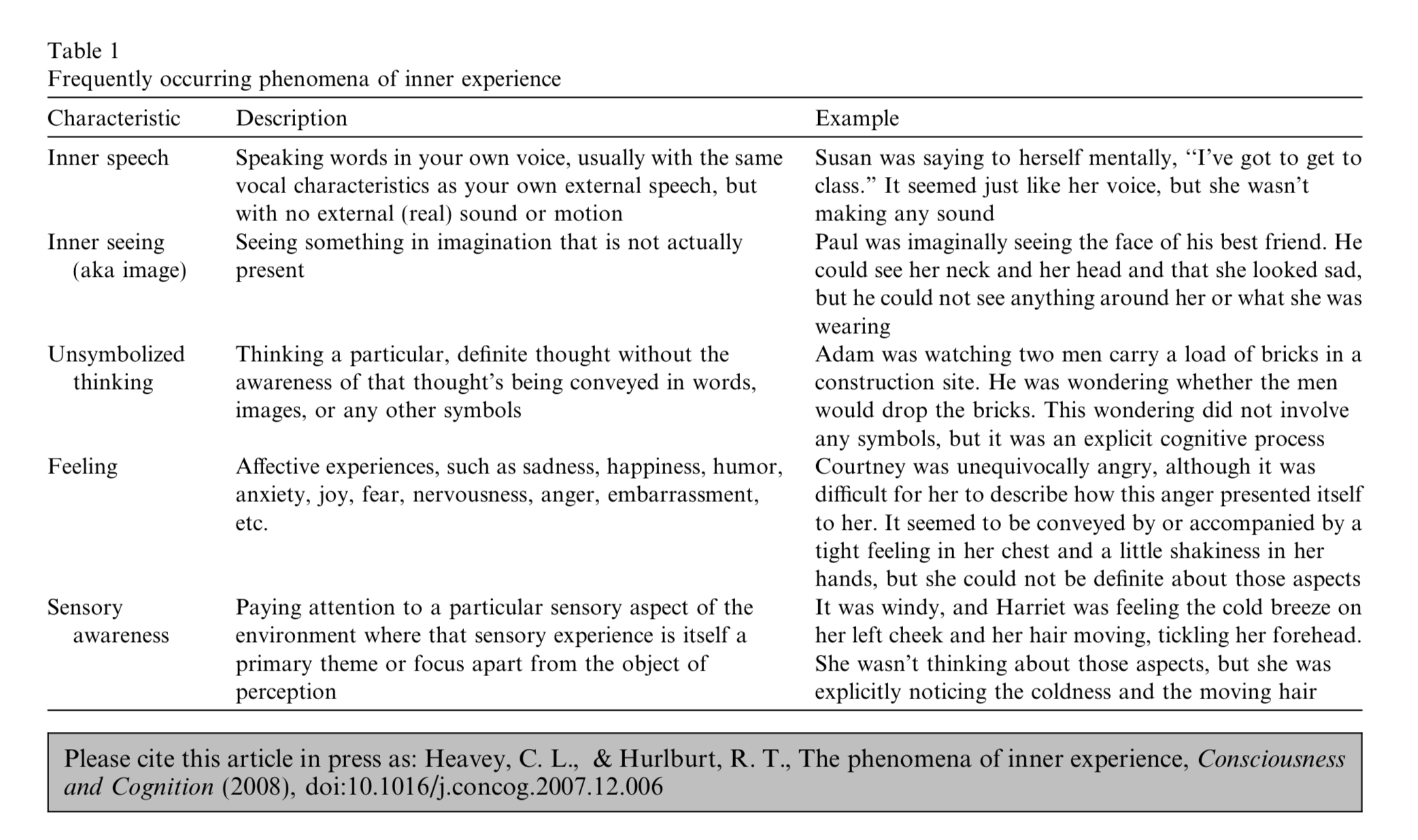Back in 2007, C.L. Heavey and R.T. Hurlburt identified five frequently occurring phenomena of inner experience, including “inner speech”.