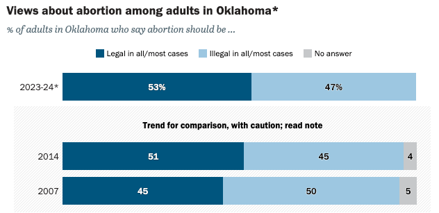The lopsided politics in Oklahoma have yielded a draconian approach of abortions only being legal if necessary to save the life of a mother. However, it is worth noting that the majority say abortion should be legal in all or most cases.