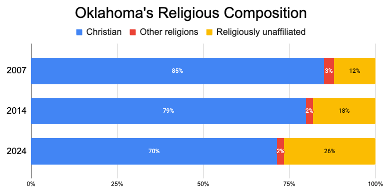 Oklahoma is known as a very religious and politically conservative state, but the study confirms a significant increase in the religiously unaffiliated over the past two decades.