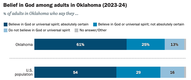 Since 2007, the percentage of Oklahomans who believe in nothing in particular has risen from 9% to 12%, agnostics have risen from 3% to 9%, and atheists have risen from less than 1% to 5%. Another lens to apply is belief in God: