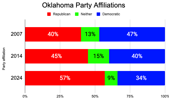 The lopsided party affiliations in Oklahoma in 2024 contrasts to how nationwide 46% identify with Republican politics, 46% with Democratic politics, and 8% with neither.