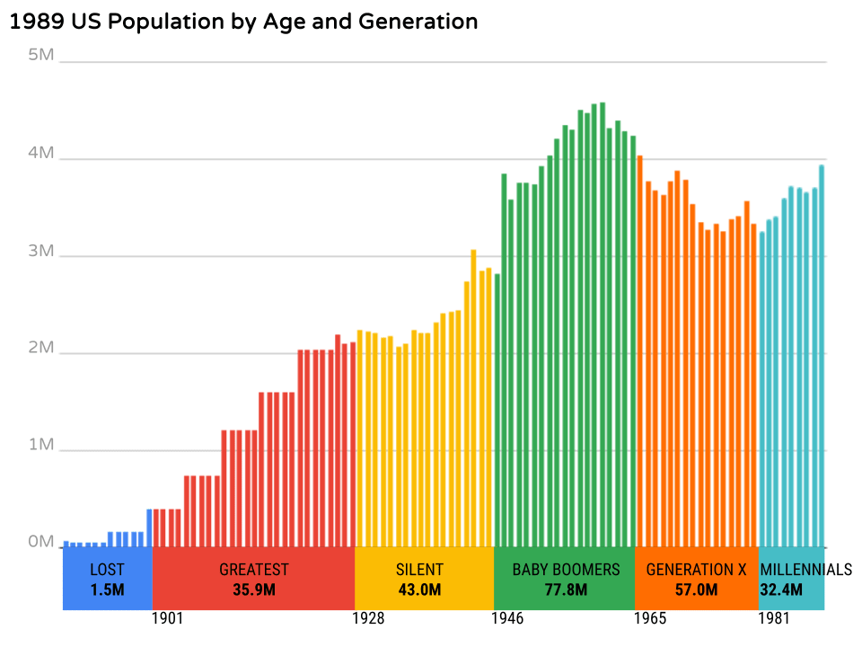 Sharp-eyed observers will note that Generation X is actually larger in the 2024 chart than in 1989 chart. I attribute that to both immigration and differences in the census methodologies of the available data sources. The relative sizes of the different generations for a given year is what is relevant for this post.