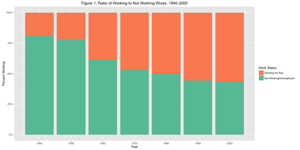 My generation was the baby bust, when the post-war procreation boom ended. Changing demographics meant that many of us grew up in a time when school enrollments had dropped dramatically and about half of our mothers who were still married started working full or part-time to sustain their family’s economic status. The bar chart below illustrates the dramatic increase in the proportion of working wives from 1940 to 2000, and that doesn’t account for single mothers.