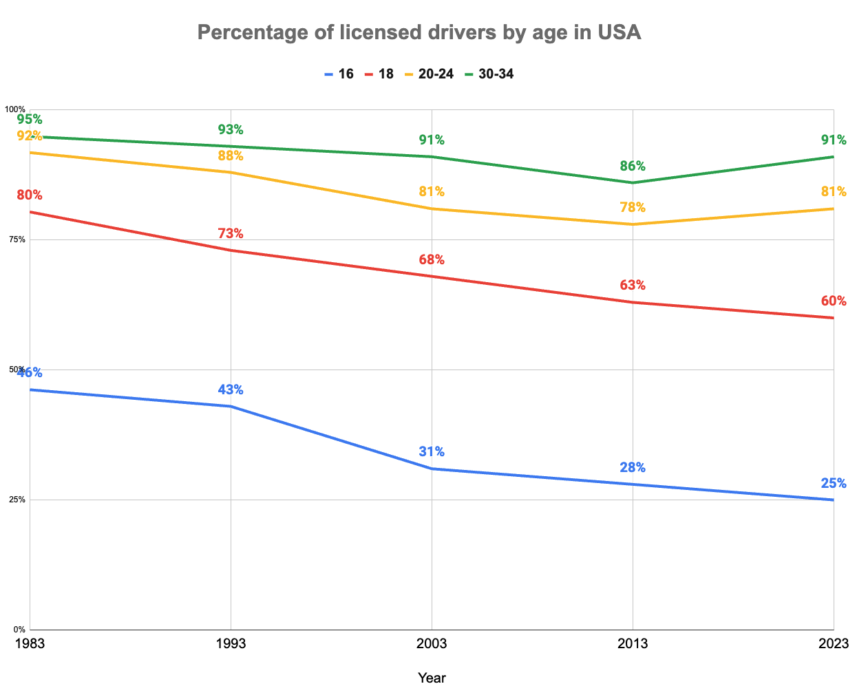 Now only 1/4 of 16-year-olds have a driver’s license, versus almost 1/2 in my youth, and licensing similarly dropped from 4/5 of 18-year-olds in 1983 to 3/5 of them in 2023. The decline is attributed to rising expense, increased availability of ride-sharing services, and teens connecting more with friends online than in-person at shopping malls, cinemas, and the like.