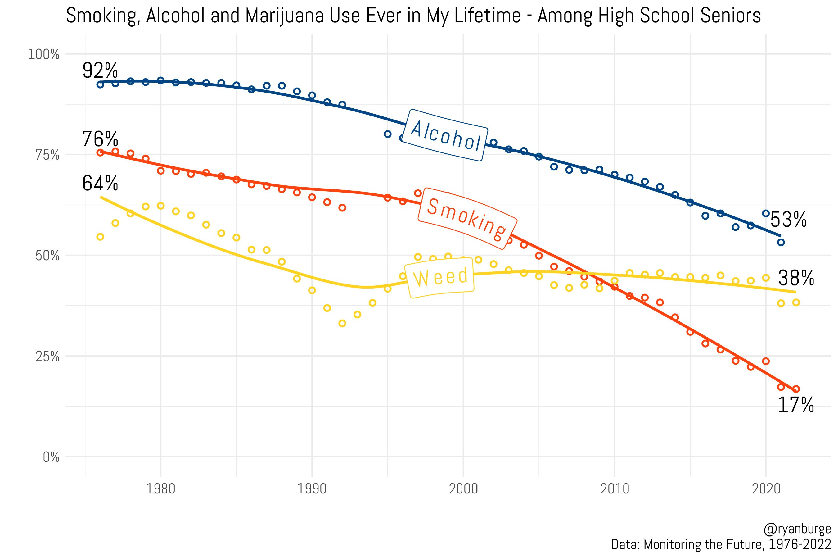Ryan Burge charted significant declines in alcohol, smoking, and marijuana use among high school seniors from 1976 to 2022: