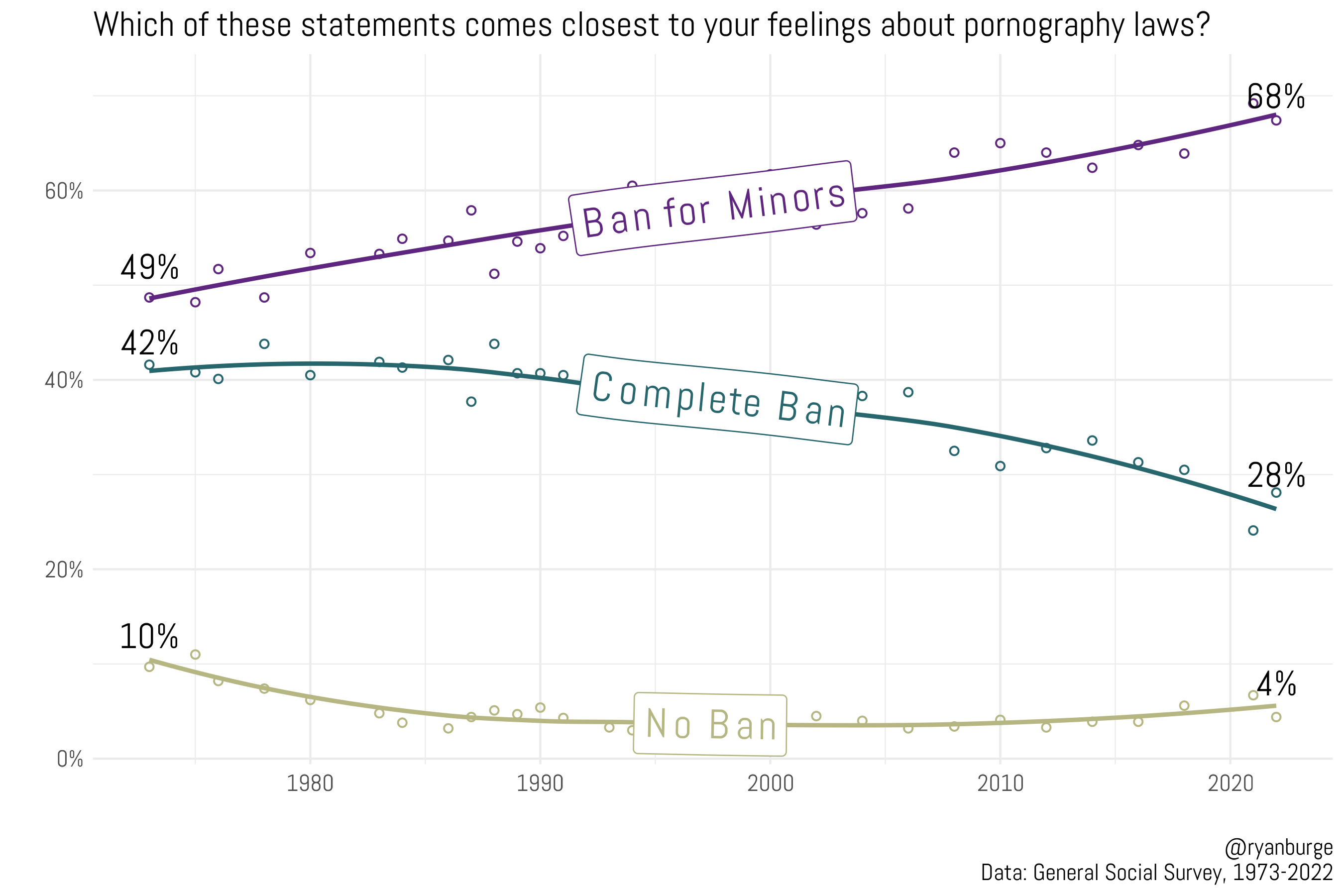 Support for banning pornography access to minors rose from about 50% when I was a kid to almost 68% in 2022, while support for complete bans on porn fell from about 40% to 28%.