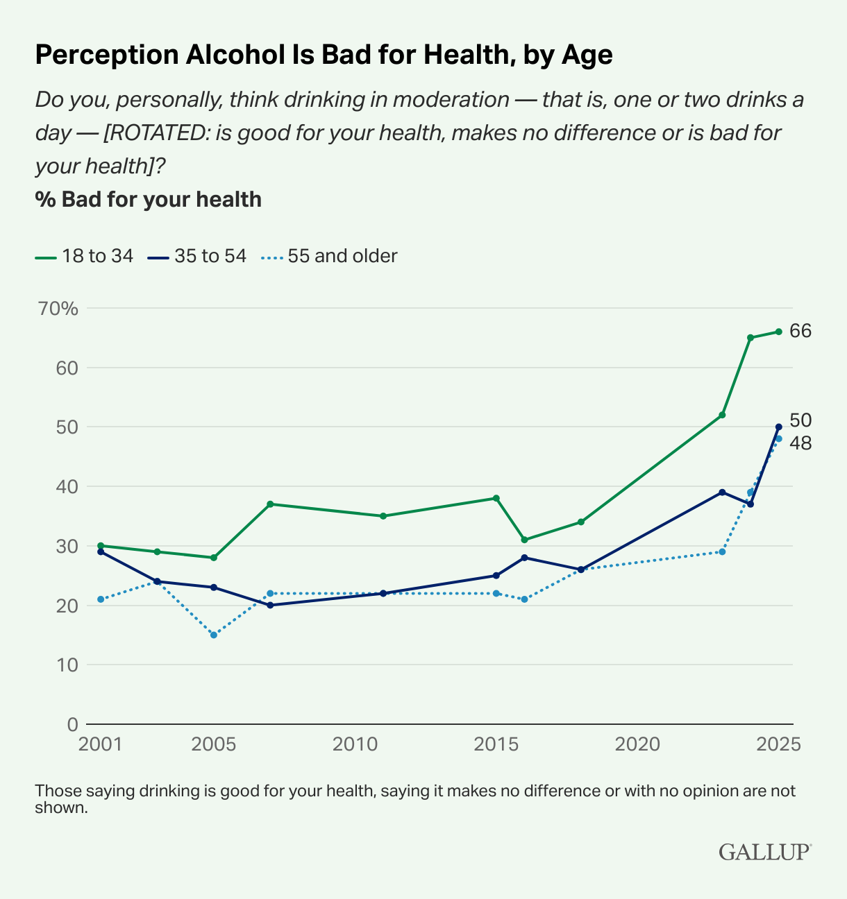 The shift in perception has occurred across all age ranges, but I find it startling that 2/3 of young adults now think drinking in moderation is bad for your health.