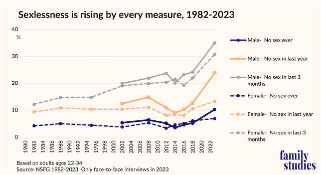 By 2022-2023, about 1 in 10 adult males ages 22-34 and about 1 in 14 young adult females were virgins, and about 1/3 of the young adult males and almost as many of the females had not had sex in the previous three months.