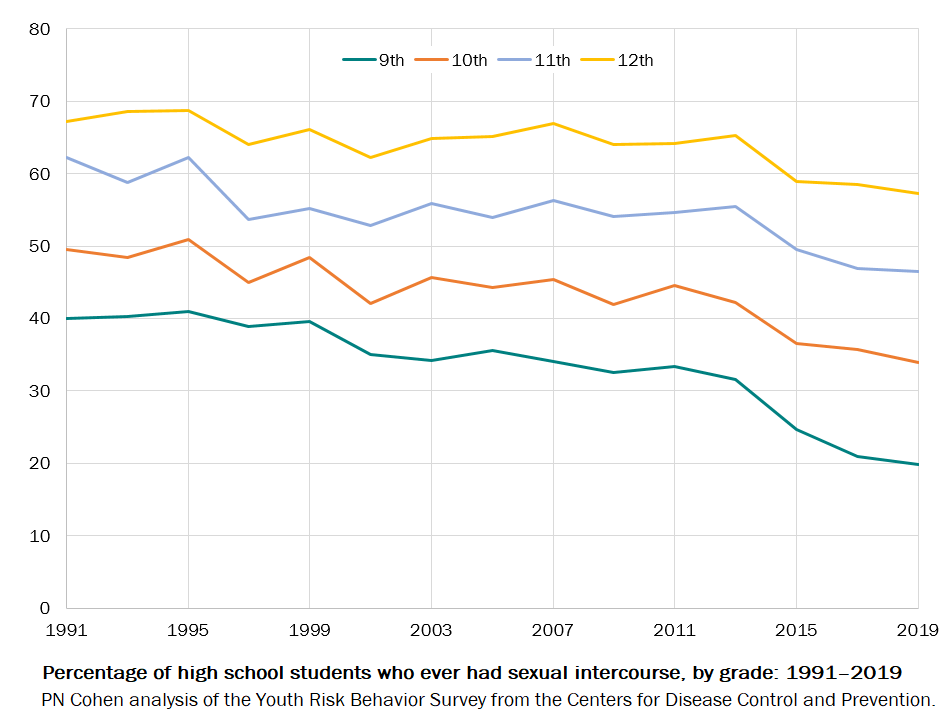 Here’s a look at the percentages of high school students who have had sexual intercourse over time: