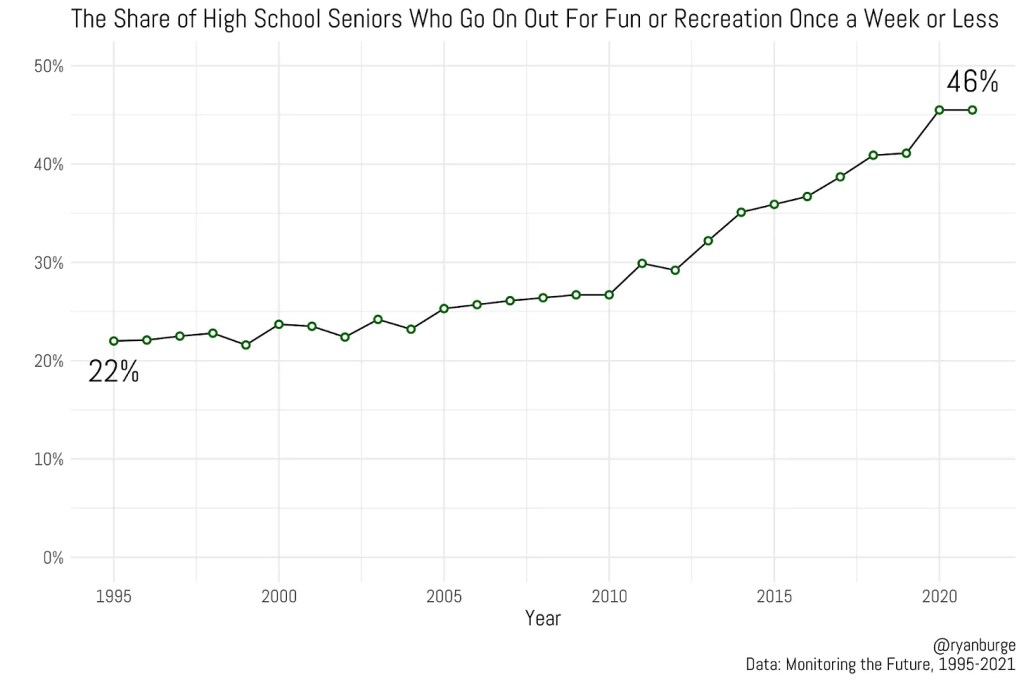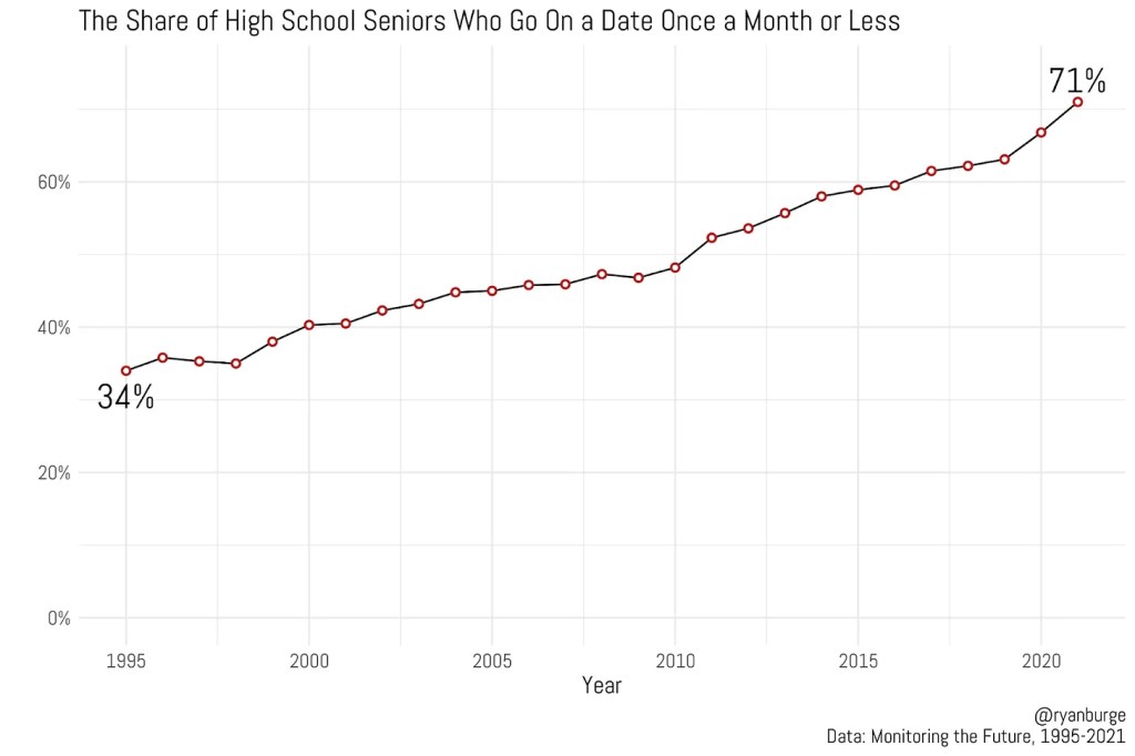 These trends are accompanied by significant changes in socialization among youngsters. Over the past 30 years, the share of high school seniors who only go on a date once a month or less has more than doubled to 71%: