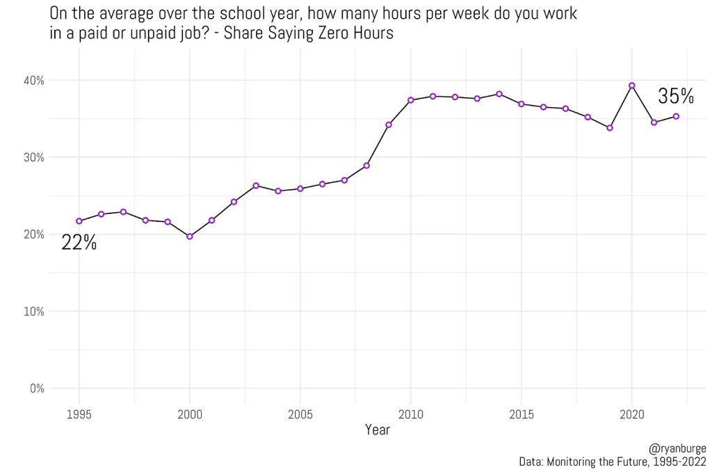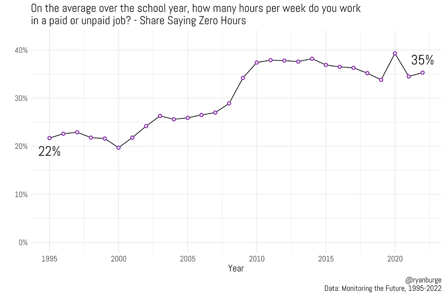 When I was a high school senior, 87% of my peers were employed, but that eroded to 78% over the following decade and is now about 2/3, with the Great Recession of 2008 being a major inflection point reducing the number of working high school seniors.