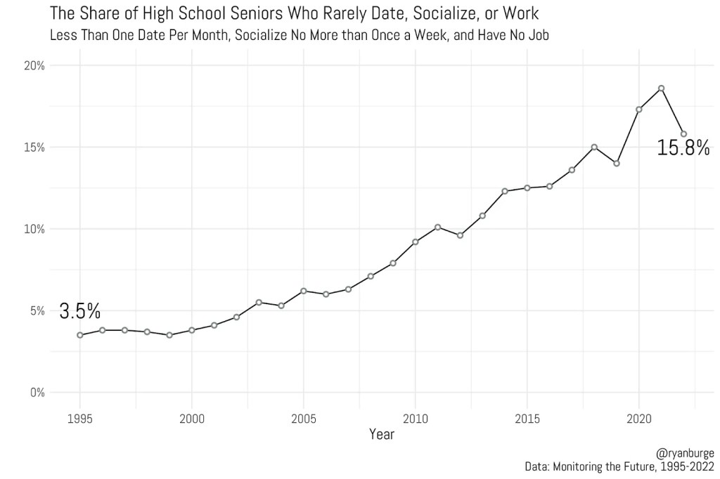 Combining those factors, almost 1 in 6 high school seniors rarely date, socialize, or work: