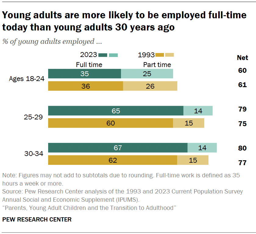 Finally, let’s look at the changing levels of independence among young adults. Here’s a comparison of young adult employment in 1993 and 2023: