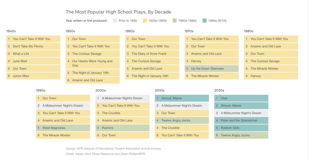 I’ve seen Our Town performed multiple times by high school students over the years. It was the most popular play for high schools in the 1950s, 1960s, and 1990s, and it was still in the top 6 in the 2010s. Its minimal sets, large number of roles, and prominent roles for females were key features bolstering its popularity.