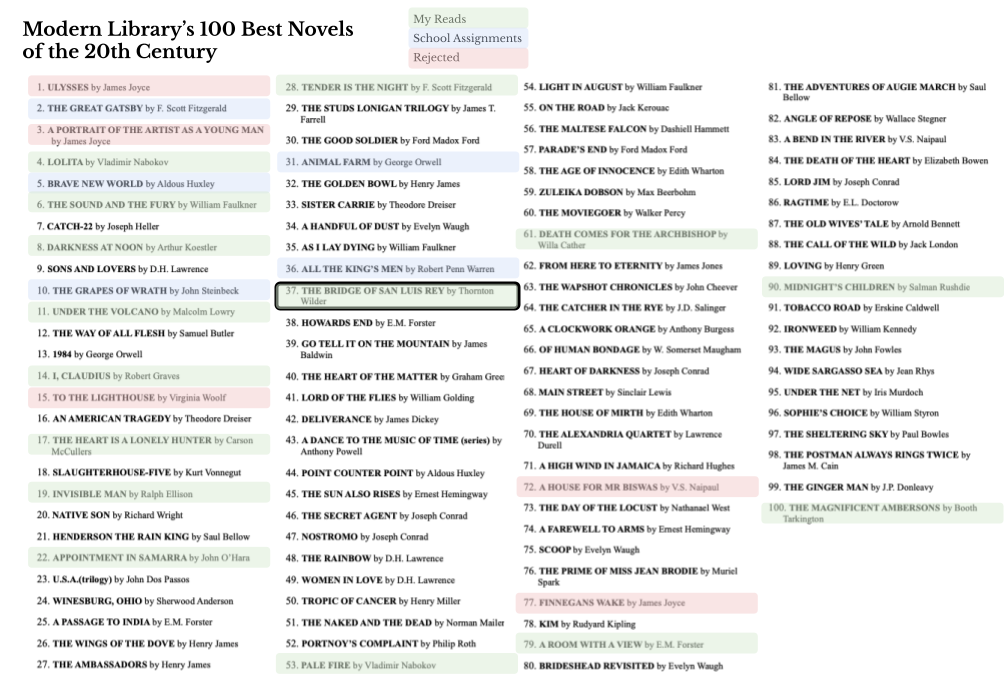 I rather suspect that Wilder’s novel only sounded familiar because of its similar title to The Bridge Over the River Kwai by Pierre Boulle, who also authored Planet of the Apes, although I’ve not read either of them, having merely seen the corresponding movie adaptations of 1957 and 1968. Kwai doesn’t even merit a ranking in The Greatest Books meta-analysis, while Apes ranks 13,716th. San Luis Rey is far more highly regarded, currrently ranked 622nd in the meta-analysis and #37 on Modern Library’s century list.