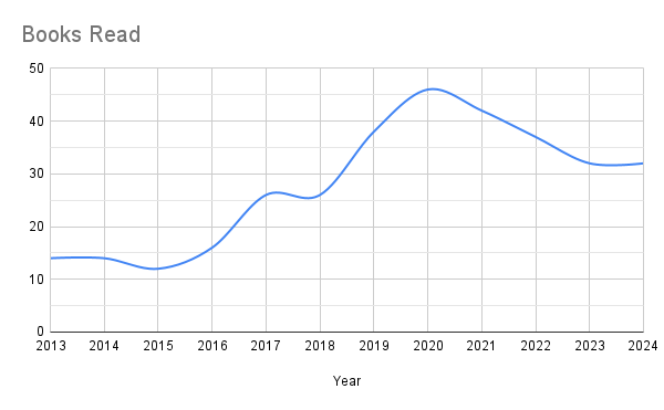 The researchers point out that the decline in reading correlates with an increase in the use of other digital media, including social media, and I already mentioned a rise in gaming. I only read 12 books in 2015, but that rose fairly steadily to peak at 46 amidst the COVID-19 pandemic in 2020, declining back to 32 for the last couple of years. The median number of books read per year in the USA is about five, with an average of a dozen, the latter statistically inflated by a small number of voracious readers.