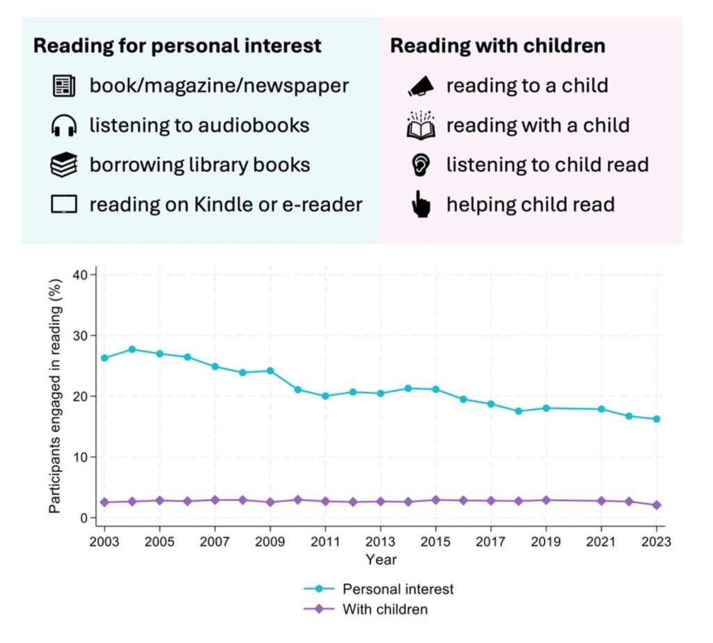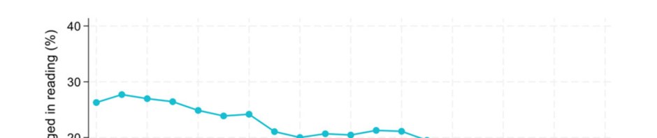 However, what prompted this post was a news article about the decline in reading. Over the past two decades, the share of readers has declined by 40%, from over 1 in 4 in 2003 to less than 1 in 6, with reading defined to include books, magazines, and newspapers in print, electronic, or audio form. As the number of readers has declined, the average time spent reading has increased from 84 to 104 minutes, although one suspects that shift is more statistical than showing an increased devotion to reading among the remainder.