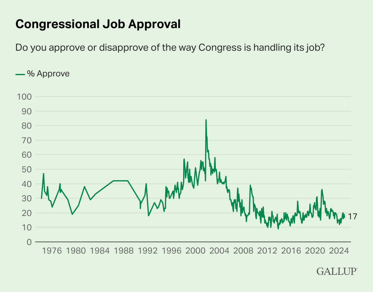 Overall Congressional job approval has traditionally been low, with telling remarks dating back to Will Rogers, Mark Twain, and much earlier. In general, people tend to favor their members of Congress far more than the institution. Its approval briefly spiked above 50% in the late 1990s and again after the 2001 terrorist attacks, but it has been quite low for most of the past two decades.