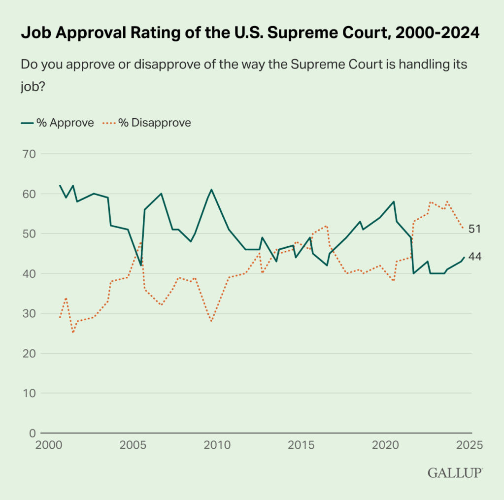 I see little point in focusing on the presidency, which is dominated by partisanship, but the judicial branch is traditionally less partisan and thus often had the highest trust. It is notable how that has plummeted over the past few years. If we focus in on the U.S. Supreme Court, its approval has flipped from strongly positive to notably negative.