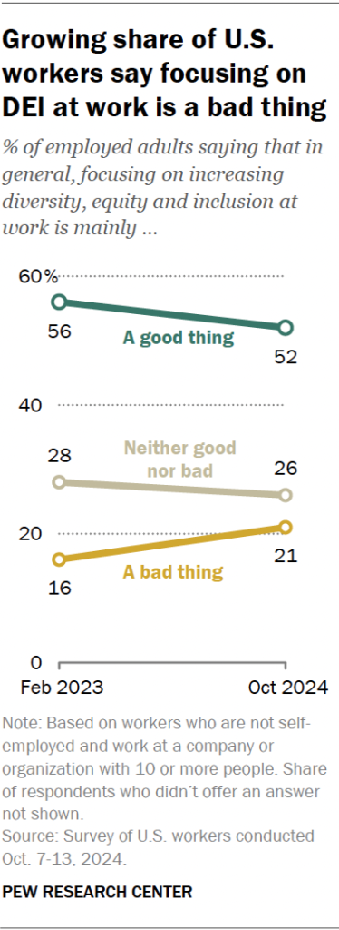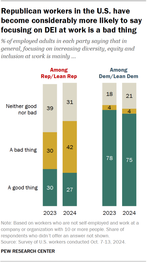 Recently many Republican politicians have pushed to ban diversity, equity, and inclusion (DEI) efforts in the government, workplace, and education. Support for DEI in the workplace has been slipping as it has become an extremely partisan issue.