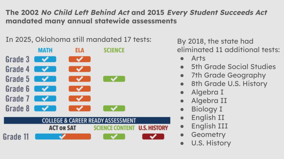 A Nation at Risk spurred the legislature to establish the Oklahoma School Testing Program, and it mandated ever more tests over the next thirty years. The mandates grew from norm-referenced tests in grades 3, 7, and 10 in 1985 to over two dozen different tests by 2007.