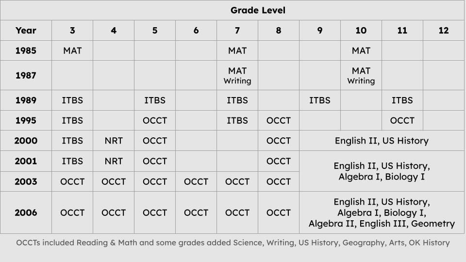 Over the years, more and more norm-referenced tests were then replaced by Oklahoma Core Curriculum Tests which were criterion-referenced. End-of-instruction tests began in seven high school subjects, with students eventually having to pass four of those tests to graduate.