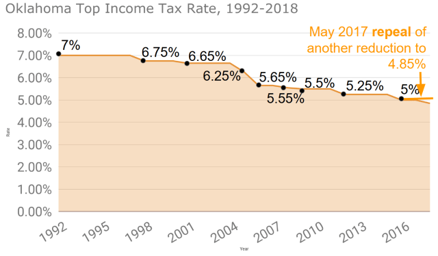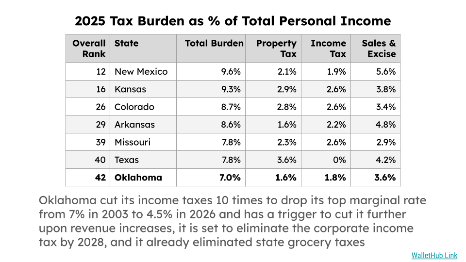 Oklahoma has only raised taxes twice in the past 33 years while repeatedly cutting various revenue sources. That has reduced the tax burden from 9.5% of personal income in 1995 to 7% in 2025 as its public schools foundered.