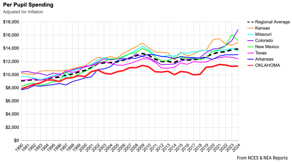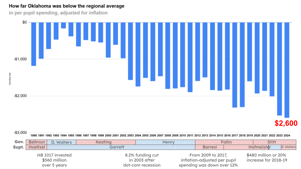 Below is a look at the inflation-adjusted spending gap: how much less Oklahoma spends per pupil than the regional average.