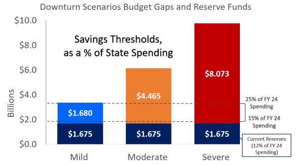 Things will inevitably take a turn for even worse in the next moderate or significant economic recession. In 2024, the legislature’s own LOFT budget stress test showed, “Oklahoma’s State Budget is not prepared to manage the effects of a moderate downturn with only its current reserves”. The study pointed out that states should hold at least 15% of prior year spending in their reserves, and states like Oklahoma that are more reliant on volatile sources of revenue should exceed that. However, Oklahoma had only 12% in reserve, and it would need a 25% reserve to cover the projected impact of even a mild downturn.