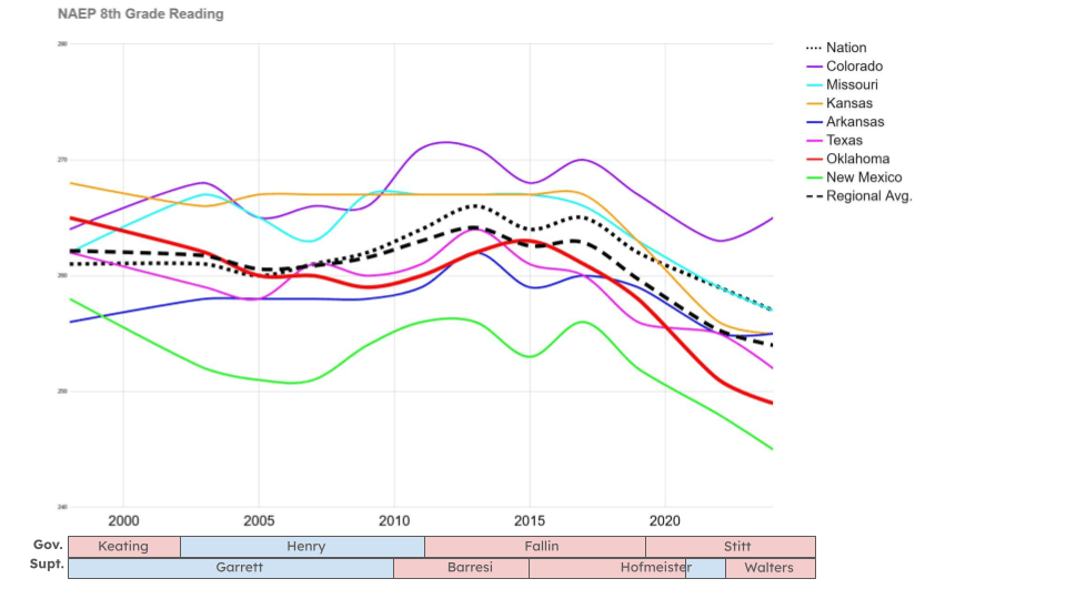 The other thing of note in the NAEP scores is how Oklahoma’s 2022 and 2024 scores fell, along with the nation’s, due to the Covid-19 pandemic, often with a widening gap between the state and national averages.