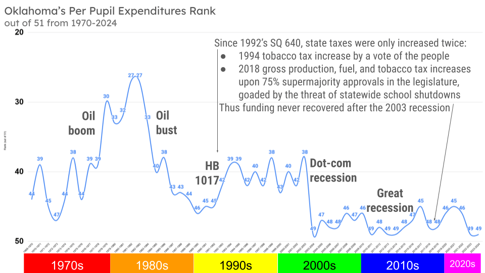 When I was an elementary school student in the 1970s, the state’s per pupil spending oscillated, but averaged about 42nd out of 51. The late 1970s and early 1980s oil boom allowed that to balloon to about 30th when I was in junior high and high school. However, the oil bust in the mid-1980s led to a dramatic drop while I was in college. Our spending dropped from 33rd in 1983 to 46th by 1989 when I started teaching in Bartlesville. That huge drop is what propelled the House Bill 1017 education reform law and its tax increases.