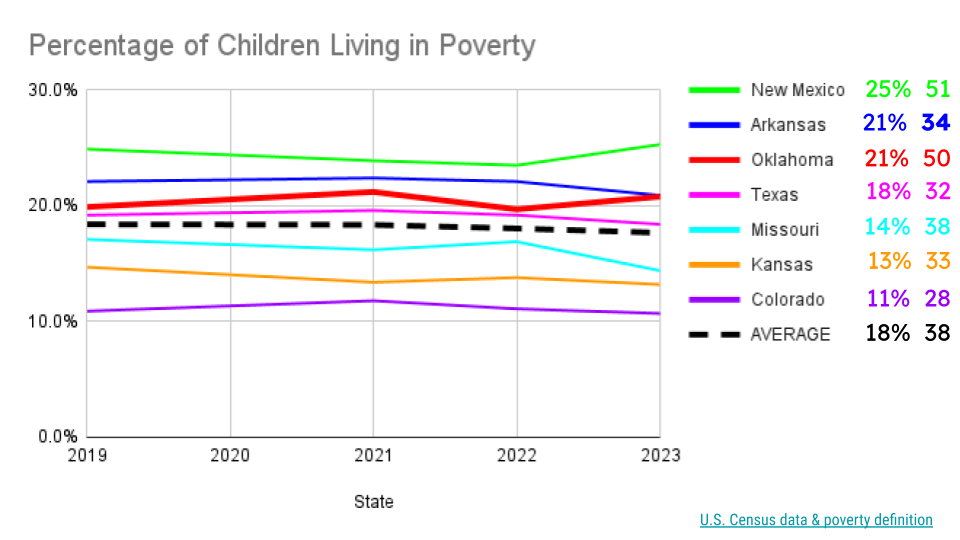 Why is Colorado at the top and New Mexico the bottom? I’d say the most significant reason is because they occupy the opposite extremes when you chart the percentages of children living in poverty.