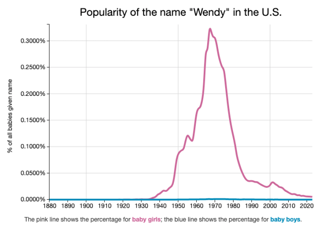 My wife is named Wendy, a name which became quite popular in the second half of the 20th century due to the character of Wendy Darling in Peter Pan. Yet my knowledge of the story is so limited, despite its many related works, that I had to go look up that character’s last name.