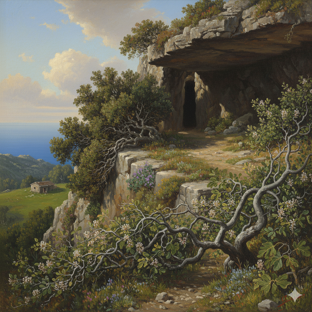 The place he chose was a wide ledge, some way above the little alp where the hut stood. As a hiding place and watch-tower combined, it could hardly have been bettered. The ledge was about ten feet wide, sloping a little upwards, out from the cliff face, so that from below we were invisible. An overhang hid us from above, and gave shelter from the weather. Behind, in the cliff, a vertical cleft offered deeper shelter, and a possible hiding-place. A juniper grew half across this cleft, and the ledge itself was deep with the sweet aromatic shrubs that clothed the hillside. The way up to it was concealed by a tangling bank of honeysuckle, and the spread silver boughs of a wild fig tree.