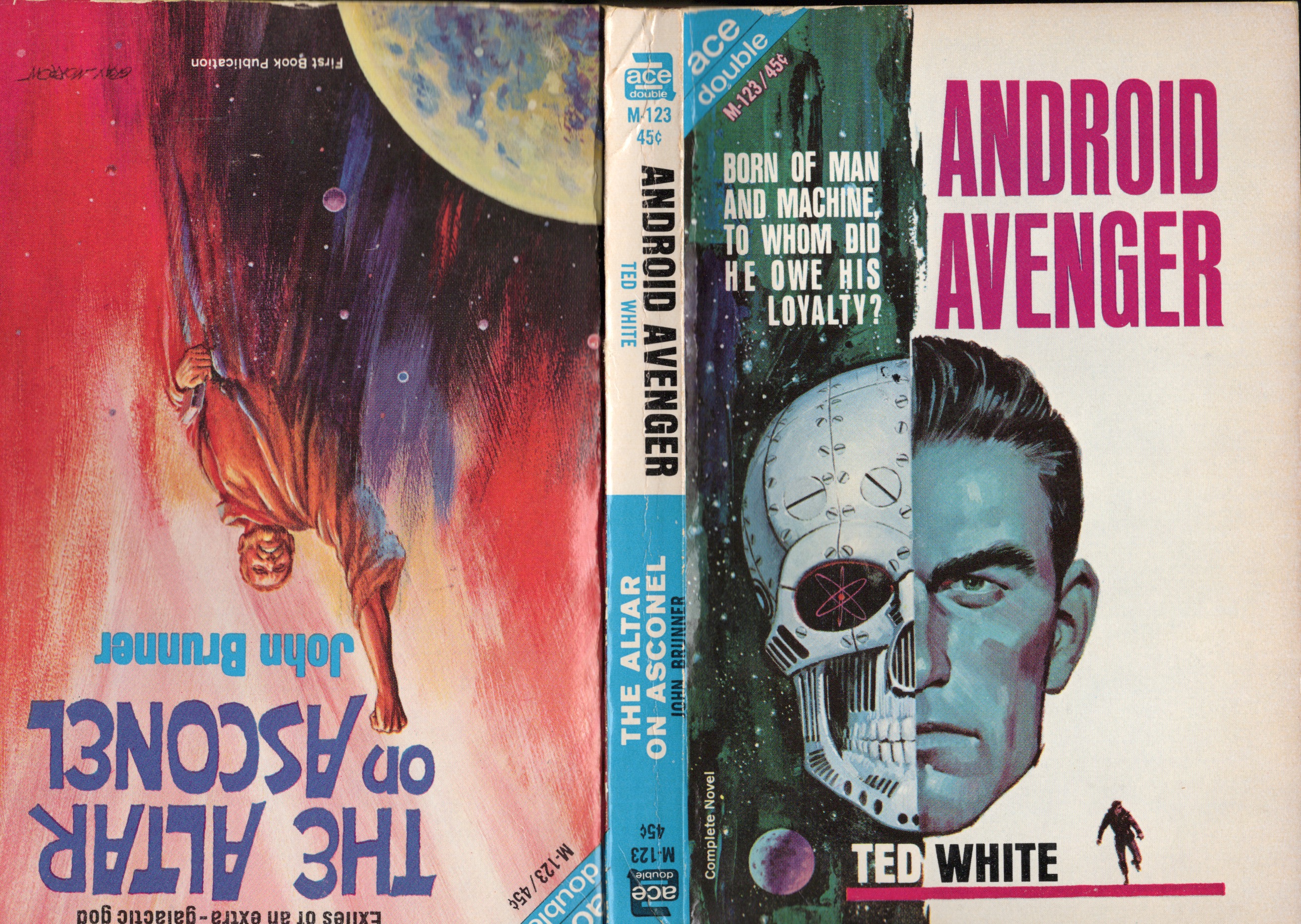 I have a soft sport for Ace paperbacks. When I was a young teenager, one of my uncles gifted me his science fiction paperbacks, which included several of the Ace doubles. The tête-bêche format books published from 1952 to 1973 each contained two novellas, with the front cover and interior of one novella rotated by 180 degrees and bound back-to-back with the front cover and interior of the other. That way neither novella is preferred, and if you buy one and end up abandoning it, you can always flip the book around and try again. I suppose you might occasionally like both stories! One of the old doubles managed to survive my Digital Age Downsizing in 2010.