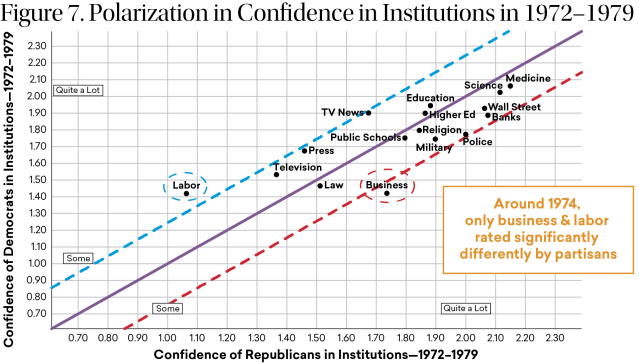 It is illuminating to examine the political polarization in confidence in our various institutions. Consider this chart of Democrat and Republican confidence in the 1970s, when there wasn’t much difference between their trust in most institutions save for Democratic confidence in labor versus Republican confidence in business: