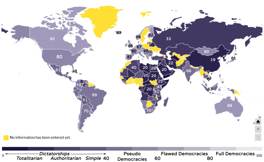 The European Center for Populism Studies has crafted a world map in which darker shades of purple indicate weaker democratic institutions and norms, with numerical ratings on a scale from dictatorships to full democracies, based on a country’s performance across fundamental human rights, civil liberties, rule of law, and elections.