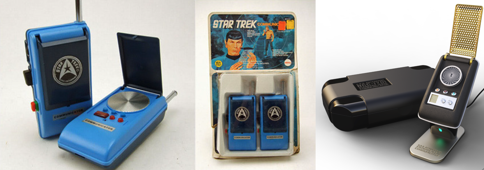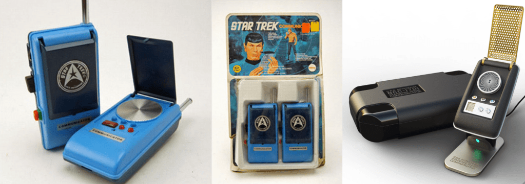 The lesson about being careful what you asked for didn’t take, however, and for my next birthday I received some blue walkie talkies marketed by Mego as Star Trek communicators. Gene and I played with them a bit, but they bore only a limited resemblance to a “real” communicator, and we had little use for walkie talkies, so after a few years they wound up in a garage sale. I built a crummy plastic phaser, communicator, and tricorder, but I didn’t have a decent toy communicator until I was given one in the 1990s, and in 2016 I purchased a superb version by The Wand Company that matched my childhood dreams.