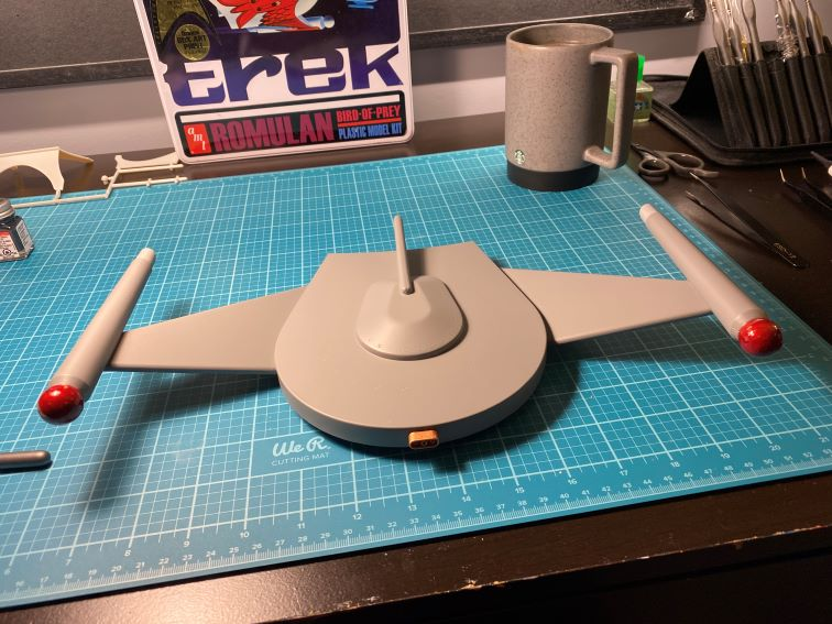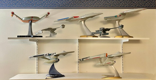 In my childhood I built models of the Enterprise, the Galileo 7 shuttlecraft, the starship bridge, and a Romulan warbird. I asked my mother for help in painting the warbird and, after I’d applied the big decal to its underside, lacquering it to protect it. That model survived the longest, but eventually all of my childhood models were in rough shape and got tossed.