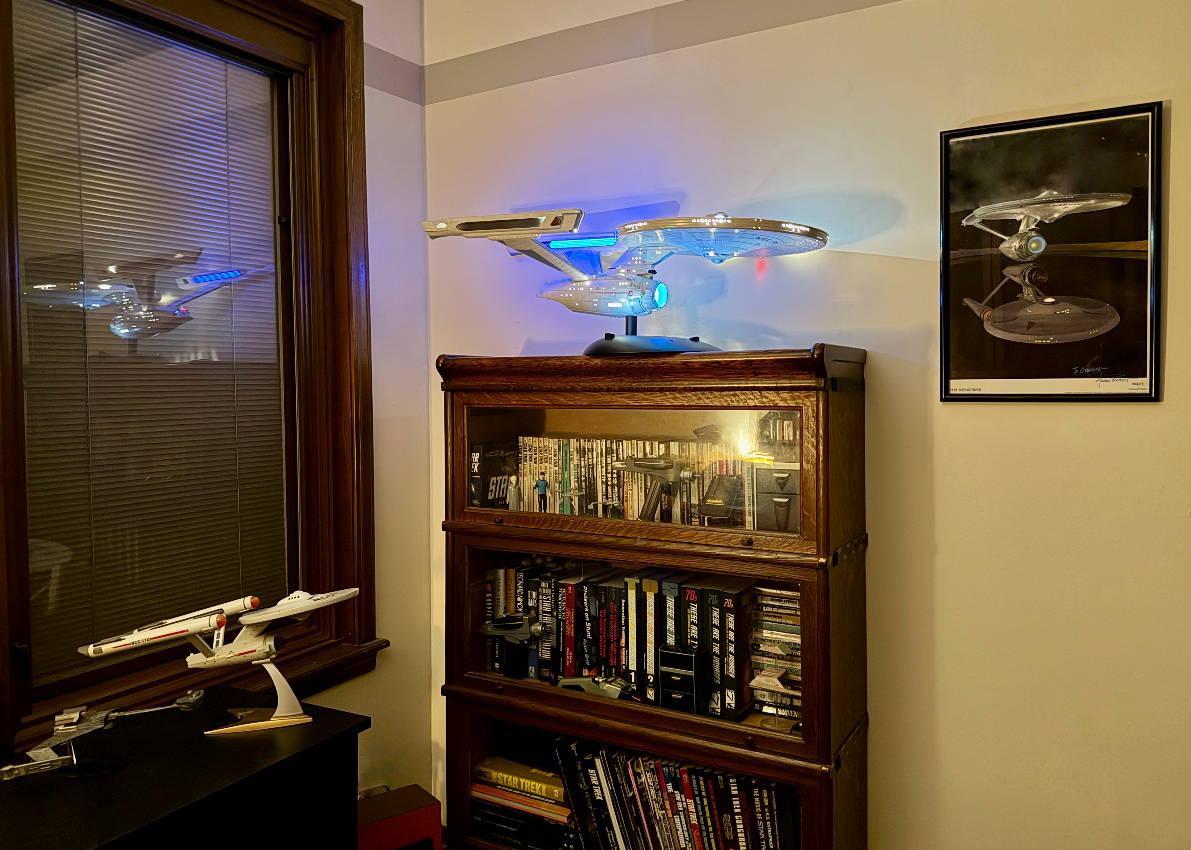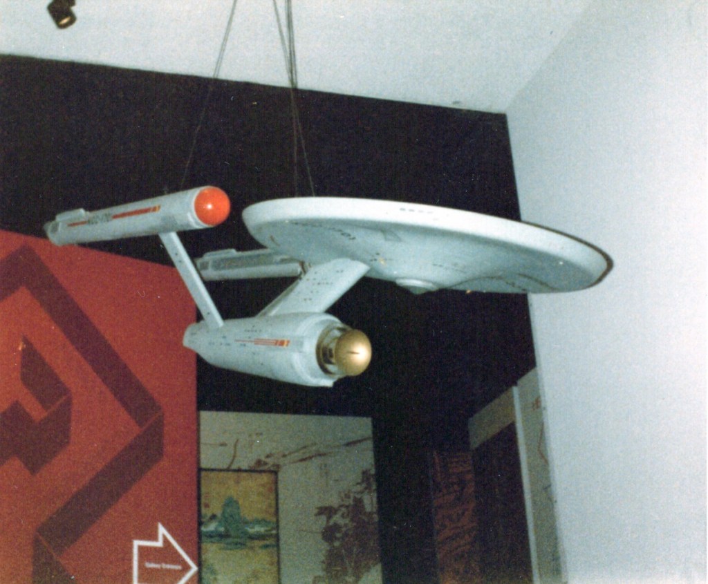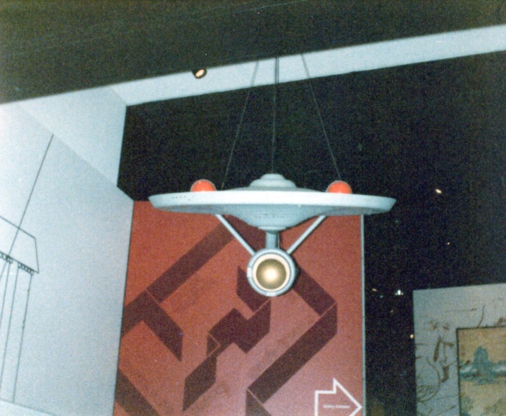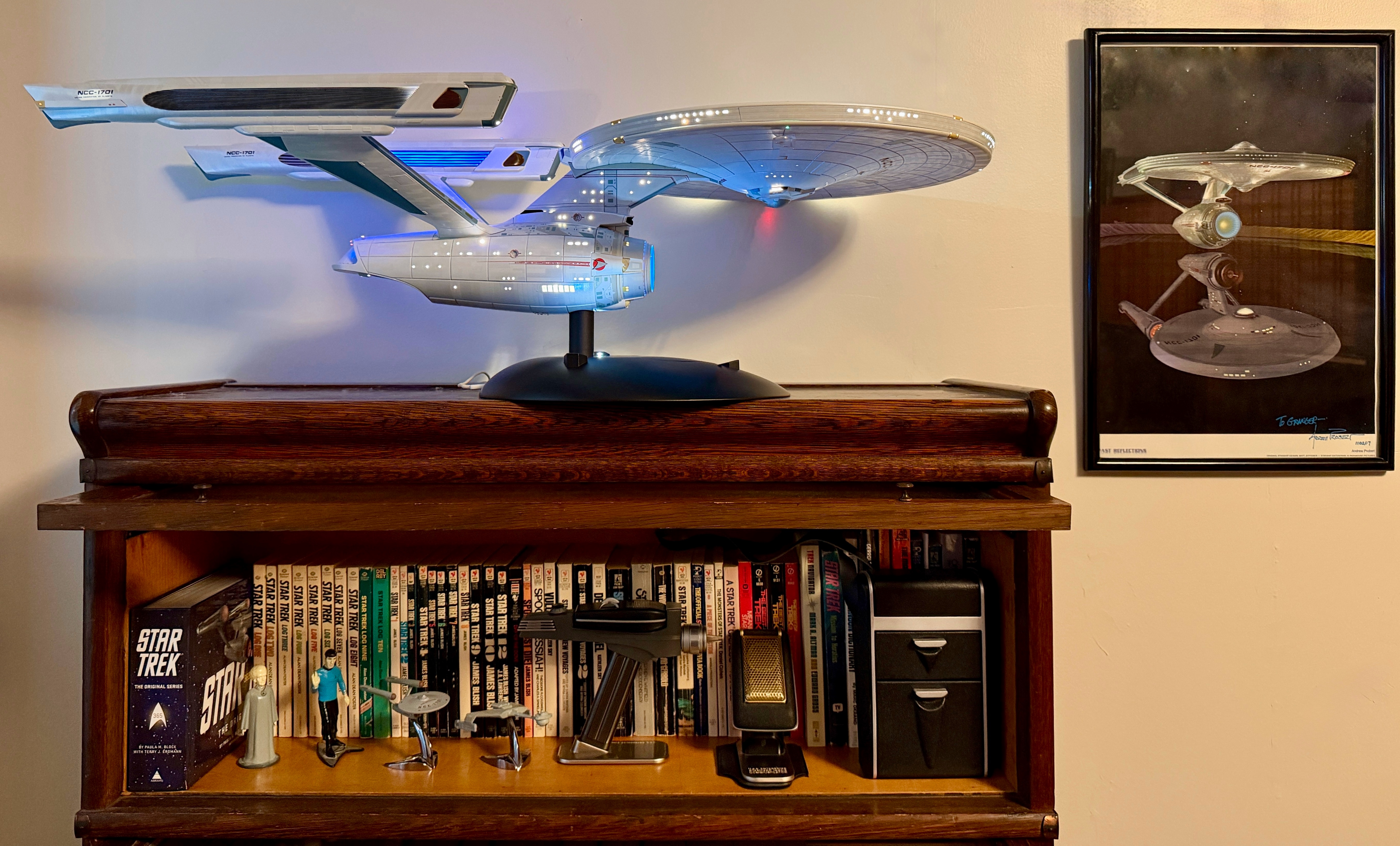 Since Andrew Probert was instrumental in the redesign of the ship for the movies, beside the model I hung his signed artwork, Past Reflections. It shows the refit suspended above a reflection of Matt Jefferies’ original design.